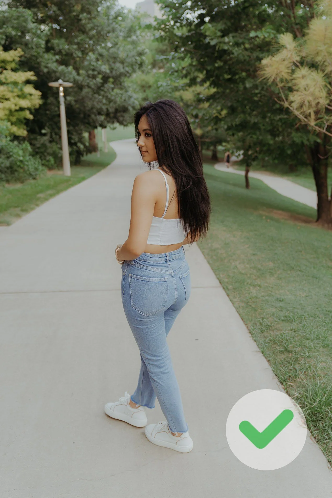 Standing at a 45-degree angle and putting one leg in front of the other will lengthen your entire silhouette and crossing your ankles will help elongate your legs. Putting one leg in front of the other is a great way to appear slimmer in your pictures.
